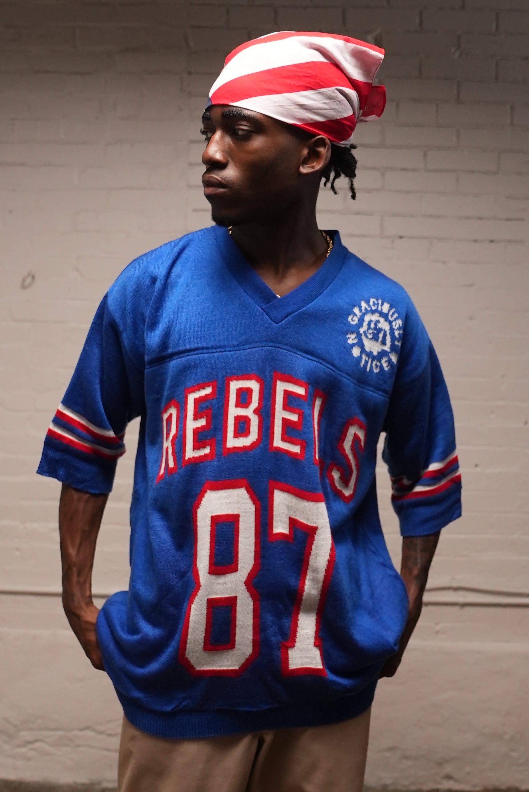 - Knitted REBELS wordmark and “87” graphic